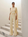 Duas peças: blusa assimétrica com capa lateral e calça de alfaiataria de cintura alta.