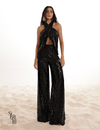 Conjunto Sabrina em paetê com blusa cruzada e calça pantalona. Brilho sofisticado para festas e eventos, disponível nas cores preto e branco. Elegância, caimento perfeito e impacto imediato no look.