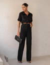 A camisa de corte reto com gola clássica e mangas curtas amplas oferece um visual clean e contemporâneo, ideal para diferentes tipos de corpo. A calça de cintura alta e modelagem ampla (wide leg) traz movimento e alonga a silhueta, garantindo conforto e elegância em todos os momentos.