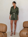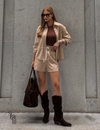 O short de cintura alta modela a silhueta com elegância, com elástico largo na cintura para ajuste perfeito e confortável. O cordão de laço decorativo frontal acrescenta um detalhe charmoso, e os bolsos traseiros dão funcionalidade sem perder o estilo. Assim como a camisa, o short conta com pespontos decorativos que reforçam o acabamento refinado. Também sem forro, é leve e ideal para dias mais quentes.