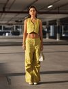 Conjunto em sarja com colete e calça de cintura alta. Moderno e versátil, ideal para compor looks estilosos com toque utilitário e elegante.