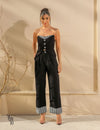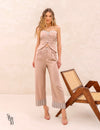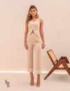 Blusa Tomara que Caia com Detalhe Listrado: A blusa do Conjunto Andromeda apresenta um elegante decote tomara que caia, realçado por um detalhe listrado que adiciona um toque de sofisticação ao visual. Sem bojo, mas com barbatanas internas para um ajuste perfeito, esta blusa oferece conforto e estilo em igual medida. O detalhe de botões frontais e a barra aberta estilo plepum acrescentam charme e elegância à peça, enquanto o fechamento em zíper nas costas garante um acabamento impecável. Calça Cigarrete com Detalhe Listrado na Barra: A calça do Conjunto Andromeda é um modelo cigarrete, que combina perfeitamente com a blusa e adiciona uma dose extra de estilo ao conjunto. Com um detalhe listrado na barra, cintura alta e bolsos laterais, esta calça é uma escolha versátil e elegante para qualquer ocasião. O fechamento em zíper e botão frontal garante praticidade e conforto ao vestir.