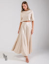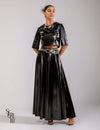 Cropped Deslumbrante: O cropped apresenta um decote U que valoriza a feminilidade, mangas curtas que adicionam um toque de delicadeza e é confeccionado em vinil, proporcionando um brilho sutil e uma aparência luxuosa. Saia Evasê Encantadora: A saia longuete tem um estilo evasê que cria uma silhueta deslumbrante, enquanto a cintura alta oferece uma aparência alongada e elegante. O fechamento em zíper na lateral garante um ajuste perfeito.