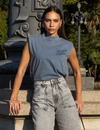 Regata com ombreiras e frase estampada “Liberdade em Espera”. Moderna, leve e versátil, disponível nas cores cinza, azul e branco.