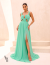 A saia longa fluida com fenda lateral garante movimento e leveza, além de adicionar um toque de ousadia ao design. O caimento impecável é complementado pelo fechamento ajustado nas costas, garantindo conforto e segurança. O tecido, com seu acabamento impecável, e o design em camadas fluídas conferem elegância e sofisticação ao look.