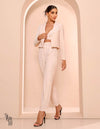 O trijunto é composto por por três peças um blazer, um top e uma calça. O blazer possui gola social, comprimento cropped, mangas longas , forro interno e fechamento em botão frontal. O top possui decote V, alças finas com reguladores de tamanho transpassada nas costas, elástico na barra, o modelinho não possui bojo e não possui fechamento em zíper ou botão pois possui elástico na barra para vestir adequadamente. A calça é um modelinho cenoura, possui cintura alta, detalhes vazados nas laterais, possui pregas frontais, fechamento em zíper e botões e possui forro interno.