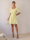 Vestido Curto Manga Bufante com Faixa Cristal Areia