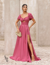 Vestido longo acetinado com fenda lateral na saia. Elegante e marcante, ideal para ocasiões especiais com toque de sofisticação.