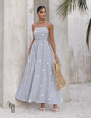 Vestido longo listrado com delicado bordado, perfeito para um visual leve, elegante e cheio de charme.