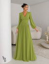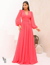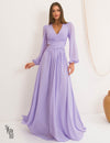 A peça é um modelo longo, decote V com detalhes franzidos, detalhe de cós cruzado e vazado nas laterais, mangas longas com elástico na barra, possui bojo interno, cintura marcada, fechamento em zíper nas costas e possui forro.
