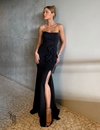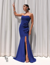 Vestido longo tomara que caia com flor, confeccionado em scuba crepe. Elegante, sofisticado e perfeito para ocasiões especiais e eventos marcantes.